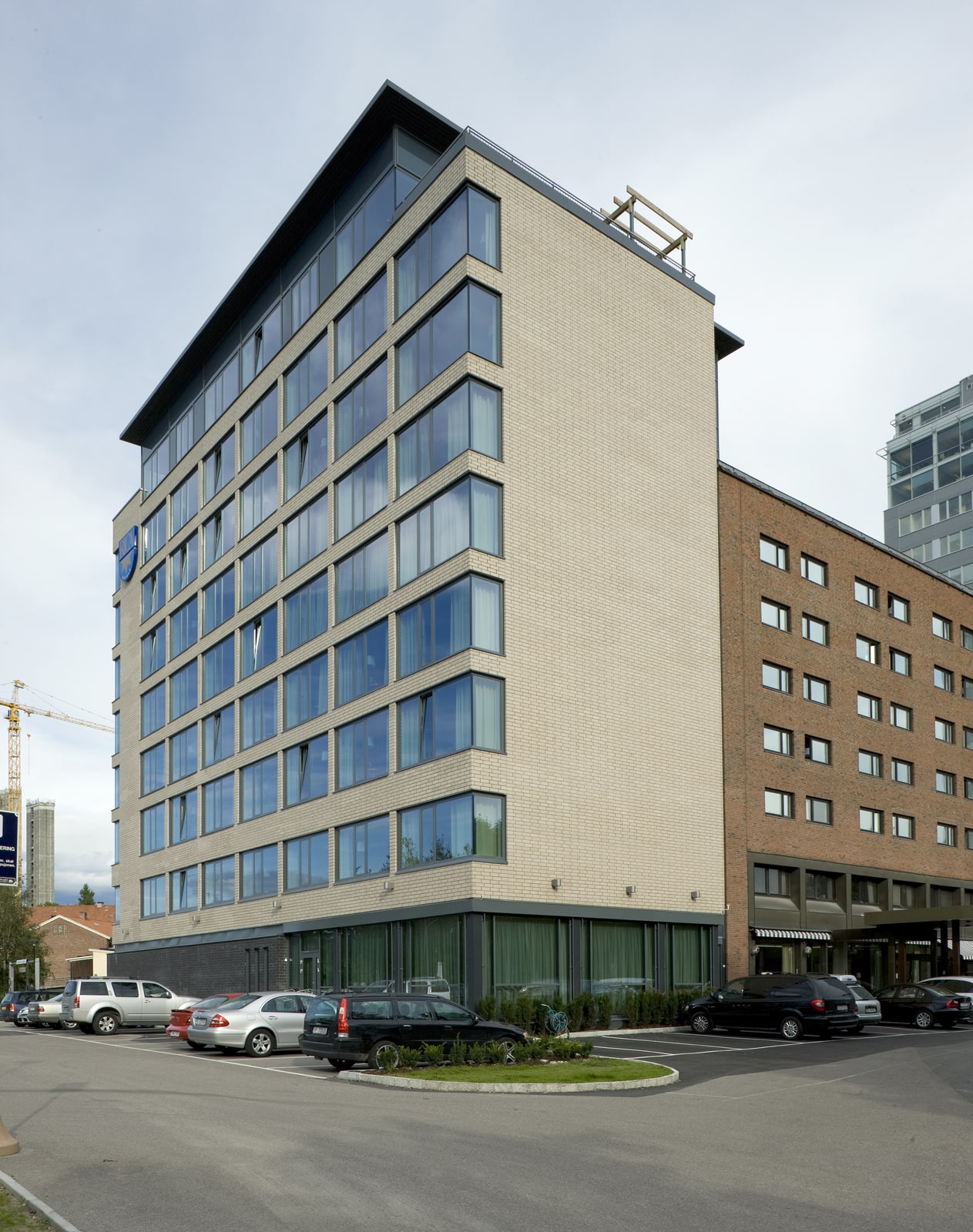 Det gamle hotellet har rød tegl i god 70-tallsstil. Den nye bygningskroppen er forblendet med beige tegl. Mot nordvest er det flott utsikt mot byen og rommene har fått vinduer i rommets fulle bredde og ned til gulvet. Toppetasjen har eksklusive suiter.