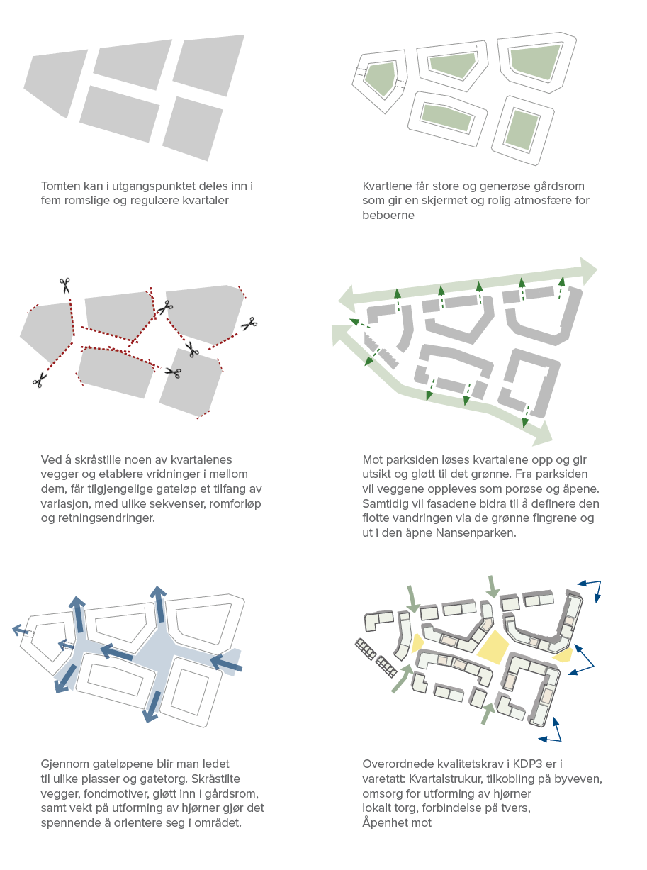 I utviklingen av forslaget har vi studert tomtens muligheter og begrensninger. Vi har jobbet med innhold og funksjon ute og inne, og tatt i bruk kjente prinsipper for byplan og komposisjon for å sikre trivsel og tilhørighet. Vi har særlig studert det klassiske storkvartalet.