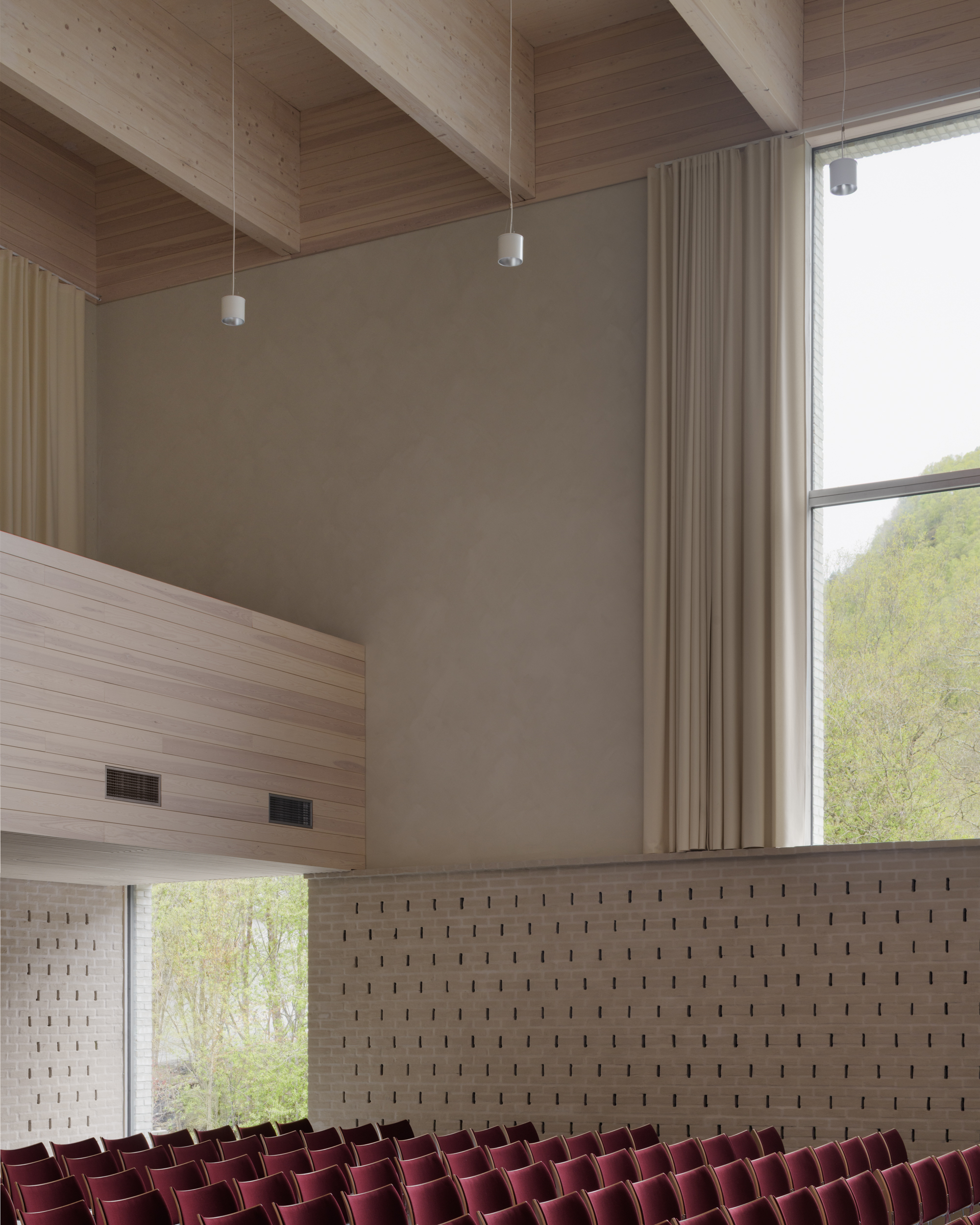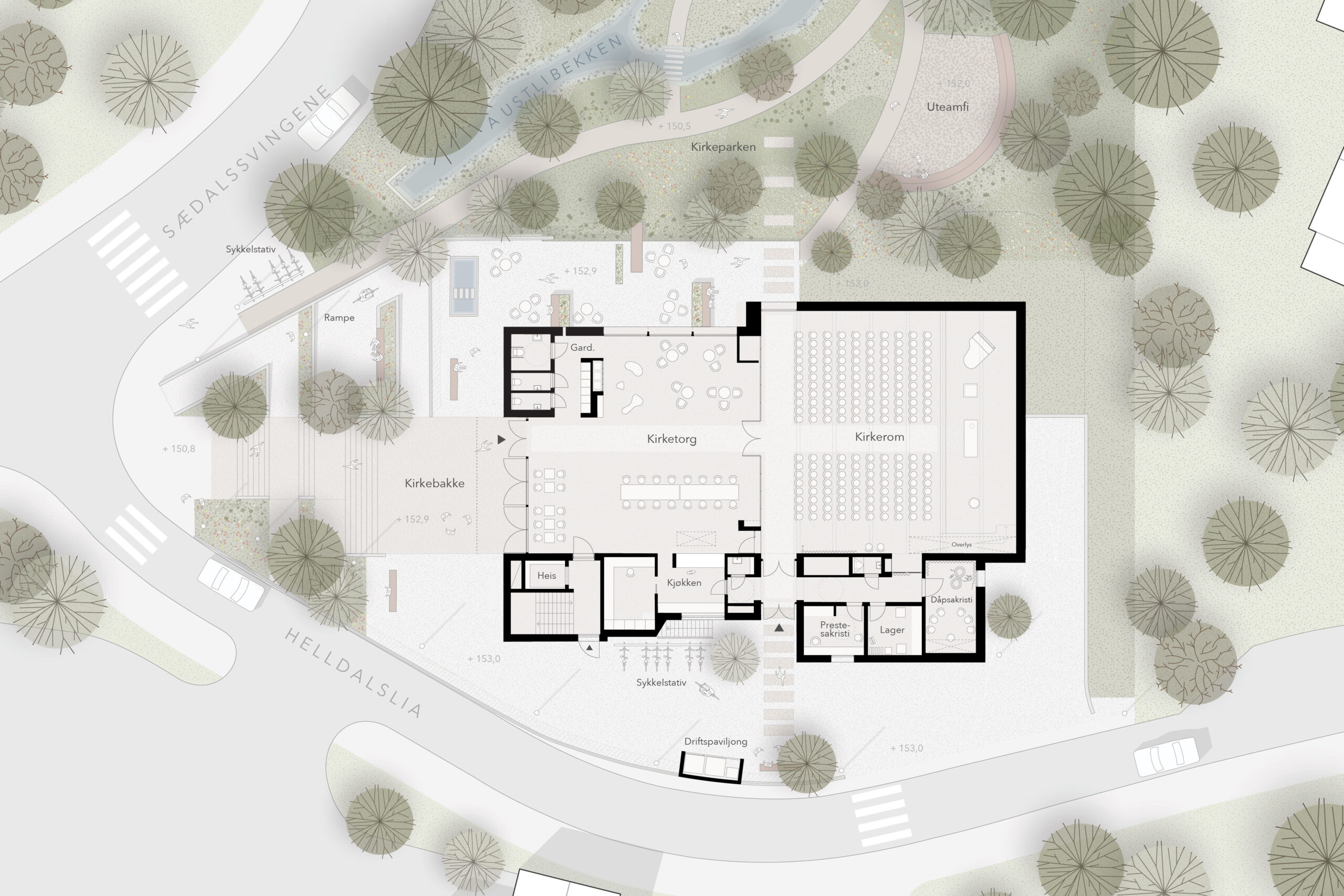 Uteområdene er like viktige som bygget selv. Kirkeparken og kirkeskogen er utformet med stier, amfi, kirsebærlund og lekeplasser, og gir rom for både aktivitet og ro. Prosjektet har et tydelig bærekraftfokus, med varige materialer, solcellepanel på taket, jordvarme og naturbasert overvannshåndtering. Sammen skaper dette en kirke som står støtt – både fysisk og sosialt – som et samlende og bærekraftig midtpunkt i Sædalen.