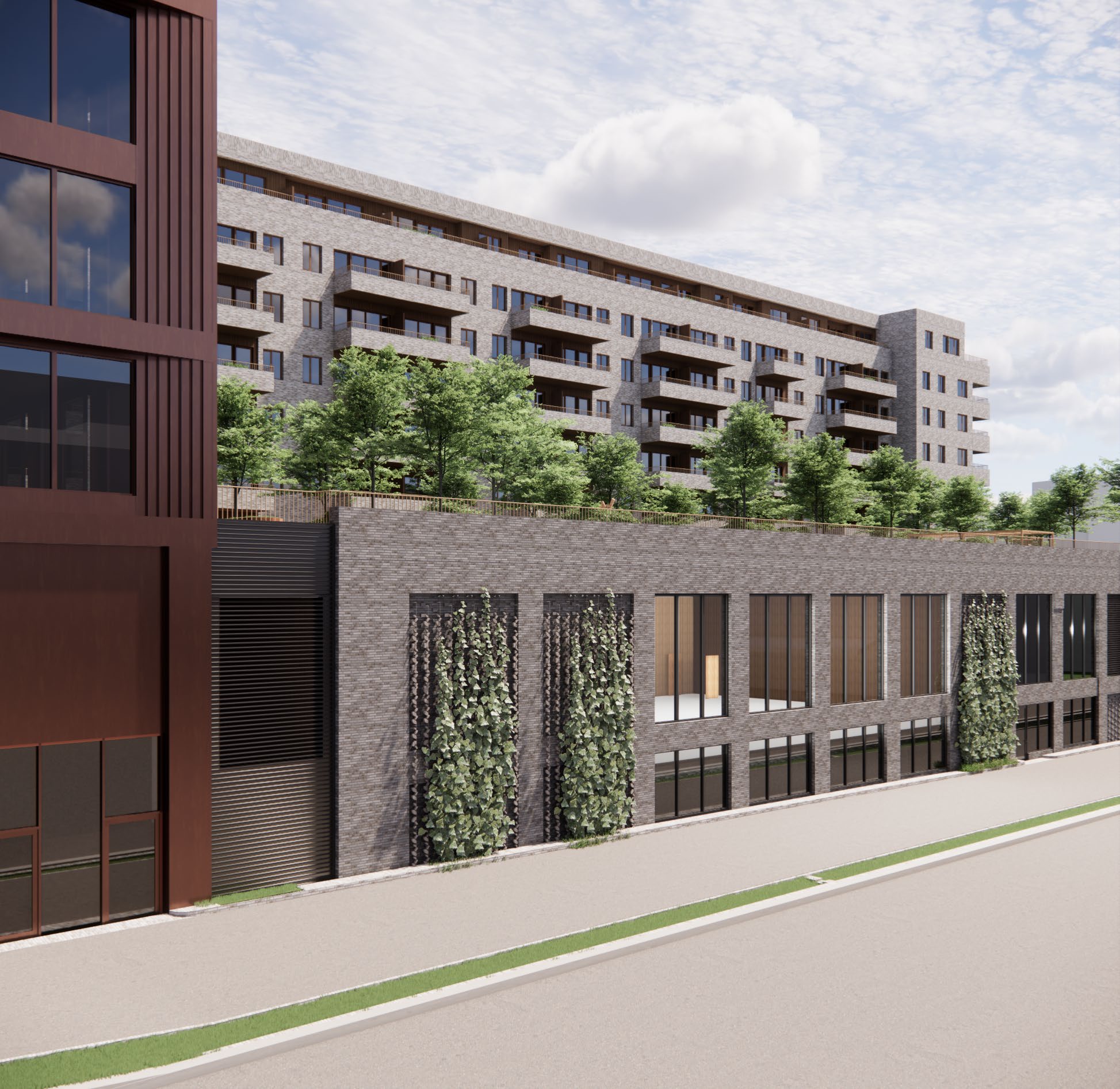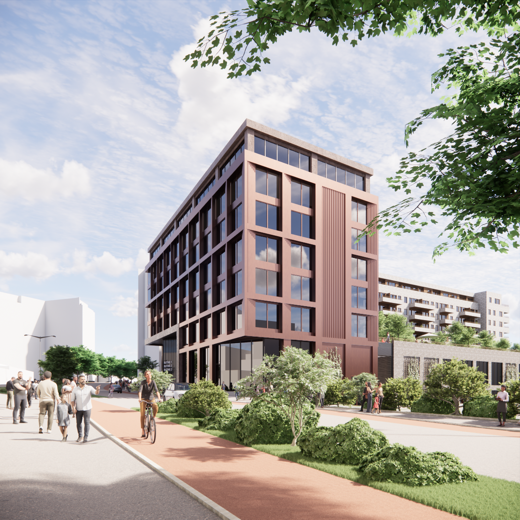 Den tredje bygningsdelen, næringsdelen, kompletterer kontor-og boligbygget. Her etableres det lokaler for utadrettet virksomhet i gaten som krysser Vitaminveien. Fasaden brytes opp med store vindusflater, klatreplanter og areal avsatt til kunstverk. Teglfargen her er planlagt noe mørkere enn i boligdelen, for å skape et harmonert fargespekter.