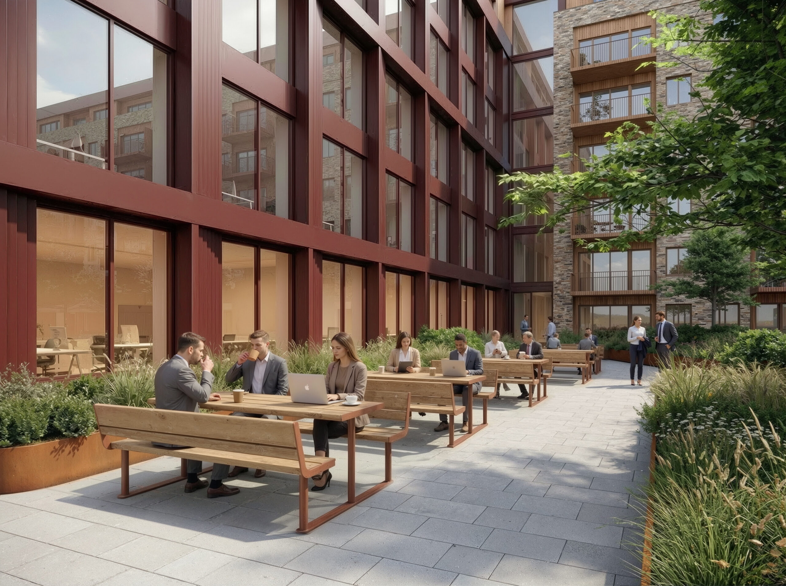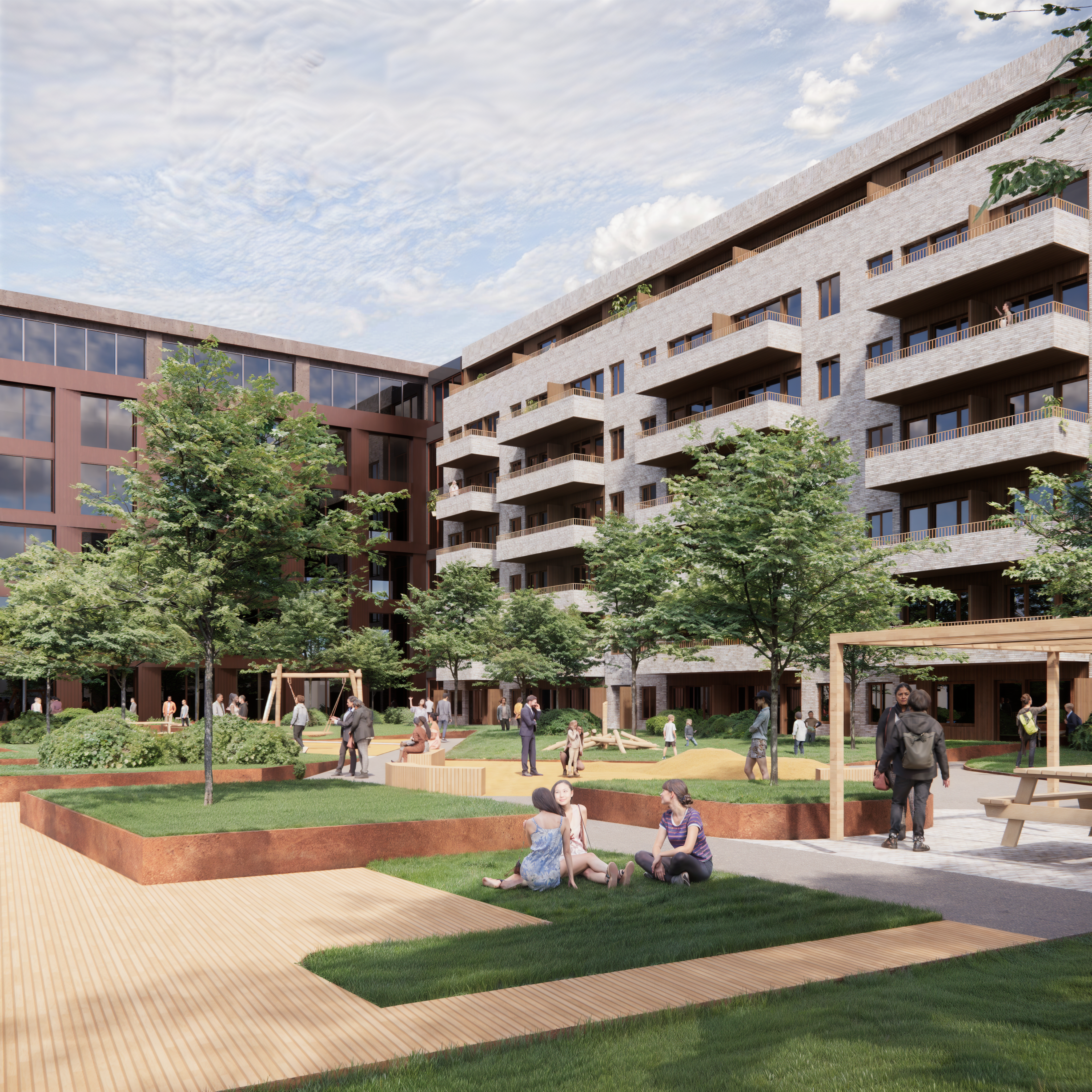 Takhagen i vest er plassert på toppen av nærlingsbygget, og den løftede etasje vil fremstå som en solfylt oase i nabolaget. Alle leiligheter har utsyn og balkonger mot vest, samt tilgang til takhagen med romslige uteområder. Toppetasjen på boligdelen er også trukket tilbake for pen avslutning, samt for å muliggjøre etablering av skjermede takterrasser.